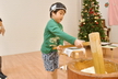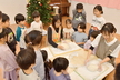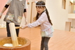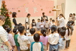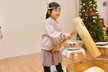 ホールに子ども達全員が集まり、もちつきをしました。ひまわり組のこども達は豆絞りを頭につけて気持ちも十分!今か今かともち米の到着を待ち、給食室から炊きたてのもち米が運ばれてくると、ボールの中のもち米をみんなで観察!もち米のいい香りに「おもちのにおいがする!」と言う声が聞こえてきました。最初は園長先生にお願いし、もち米の粒を素早くすり潰し、杵でつける状態にしていきました。そして次はいよいよひまわり組の子ども達の出番です!一人ずつ順番で杵を受け取り、お餅をついていきました。持って初めて分かる杵の重さに、受け取った瞬間「おっ、おもい」と言うお友だちも。それでも保育園で一番年上のパワーはさすがです。「よいしょー」の掛け声に合わせて、ぺったんぺったんと頑張ってお餅をついていきました。みんなとてもかっこよかったですよ。つきたてのお餅を職員が打ち粉をまぶしたまな板で鏡もち用に形を整える様子を観察し「触りたい~」とのリクエストで触れていくと「おれのほっぺの方が柔らかいかも」等、和やかな会話の中でホールでのもちつきは終わりとなりました。小さなクラスでは即席の臼と杵を用意して遊ぶ姿も見られましたよ。出来上がった鏡餅はお寺の本堂に飾り、年明けのおはじまりで鏡開きを行う予定です。お楽しみに。
