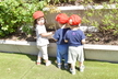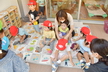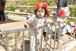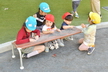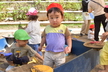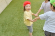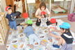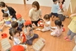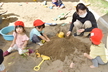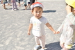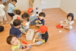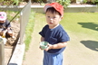 園庭に出る時には自分で帽子や靴下、靴を頑張って履いています。まだまだ難しい時もありますが、援助を少しすることで出来る児も増えてきました!一人で出来ると満面の笑顔を見せてくれています!準備が出来ると、園庭でお兄さん、お姉さんと虫探しをしたり、運動会のふれあい遊びを教えてもらいながら一緒に楽しんでいます。かけっこを見るのも大好きで、芝生の日影で「がんばれー!!」と手を叩いて応援したり、一緒に走りだそうとする微笑ましい姿もあるのですよ。また、砂場ではアイスクリーム屋さんやケーキ屋さんなどのごっこ遊びが盛んです。保育者も一緒に輪の中に入ると子ども達から「いらっしゃいませー!」と声が掛かったり、カップに砂を盛り付けて持ってきてくれるなど、いろいろなお店屋さんが開店しています。