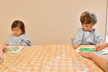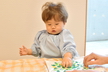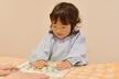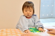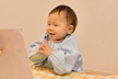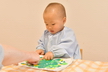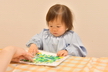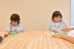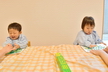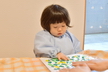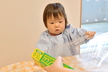 絵の具を使ったフィンガーペインティングの制作を行いました!絵の具の活動は2回目のたんぽぽさん。久しぶりの制作活動にドキドキの緊張した表情を見せる子や、保育士の言葉に真剣な顔つきで耳を傾ける子、ワクワクが止まらなくてずっとニコニコ笑顔の子などさまざまな姿を見せていて、一人ひとりのその子らしさを感じました。今回の制作は、絵の具を乗せた画用紙の上にラップをかぶせてラップ越しに絵の具を指で触ったり手の平でたたいたりしながら、絵の具が混ざり合って素敵な模様が浮かび上がる…♪という技法で行なっていきました。初めは用意された3色の絵の具が点々と置いてある白画用紙を不思議そうに見つめる子どもたちでしたが、保育士がラップを取り出すとのぞき込んだり面白そうに触っていましたよ。そしてラップをかぶせたら早速触れてみます。予想していたよりもいきなり大胆に触れる子が多くプニプニの感触を楽しみながら、たたくとタンタンと音がする様子も楽しんでいるようでした。色の違いを指差して教えてくれる子もいました。たくさん触れた後にゆっくりラップをめくってみると綺麗な模様が浮かび上がりました!最後にはもっとやりたいと思わず涙を見せる子もいて、そんな姿もとても可愛らしく楽しい制作の時間となりました。フィンガーペインティングで素敵な模様が出来たので次回はまた違った飾り付けをして、クリスマスのオーナメントとして完成する予定です。どんな風に仕上がるか、ぜひお楽しみに!!