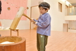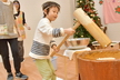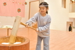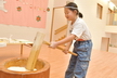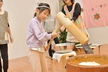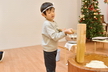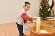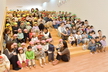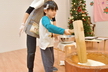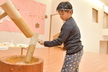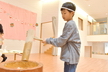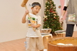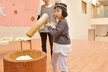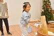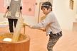 ホールに子ども達全員が集まり、もちつきをしました。ひまわり組のこども達は豆絞りを頭につけて気持ちも十分!今か今かともち米の到着を待ち、給食室から炊きたてのもち米が運ばれてくると、ボールの中のもち米をみんなで観察!もち米のいい香りに「おもちのにおいがする!」と言う声が聞こえてきました。最初は園長先生にお願いし、もち米の粒を素早くすり潰し、杵でつける状態にしていきました。そして次はいよいよひまわり組の子ども達の出番です!一人ずつ順番で杵を受け取り、お餅をついていきました。持って初めて分かる杵の重さに、受け取った瞬間「おっ、おもい」と言うお友だちも。それでも保育園で一番年上のパワーはさすがです。「よいしょー」の掛け声に合わせて、ぺったんぺったんと頑張ってお餅をついていきました。みんなとてもかっこよかったですよ。つきたてのお餅を職員が打ち粉をまぶしたまな板で鏡もち用に形を整える様子を観察し「触りたい~」とのリクエストで触れていくと「おれのほっぺの方が柔らかいかも」等、和やかな会話の中でホールでのもちつきは終わりとなりました。小さなクラスでは即席の臼と杵を用意して遊ぶ姿も見られましたよ。出来上がった鏡餅はお寺の本堂に飾り、年明けのおはじまりで鏡開きを行う予定です。お楽しみに。
